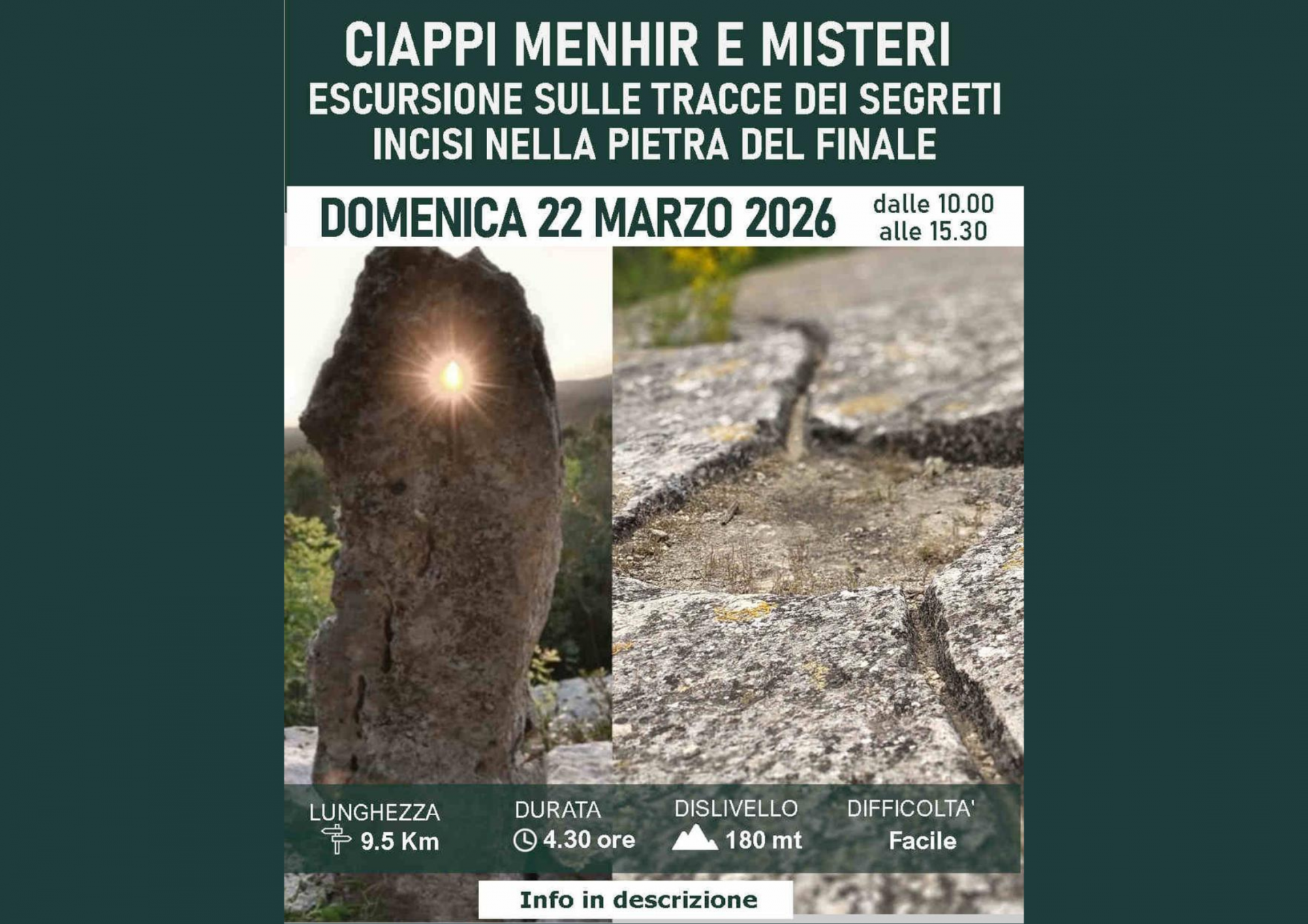 Bellissimo itinerario con basso dislivello che si snoda sull’altopiano di San Bernardino. Cammineremo sui magici “Ciappi” di Finale Ligure, enormi lastroni di roccia calcarea biancastra che affiorano dalla vegetazione e custodiscono incisioni rupestri, coppelle e canalette misteriose che sembrano mappe di un mondo dimenticato. Merita una visita il bellissimo Riparo sottoroccia detto Arma dei Buoi o “Tribunale” un interessante sito archeologico costituito da una nicchia in roccia con una serie di sedili scavati all’interno, allo scopo di creare un luogo protetto e di aggregazione.