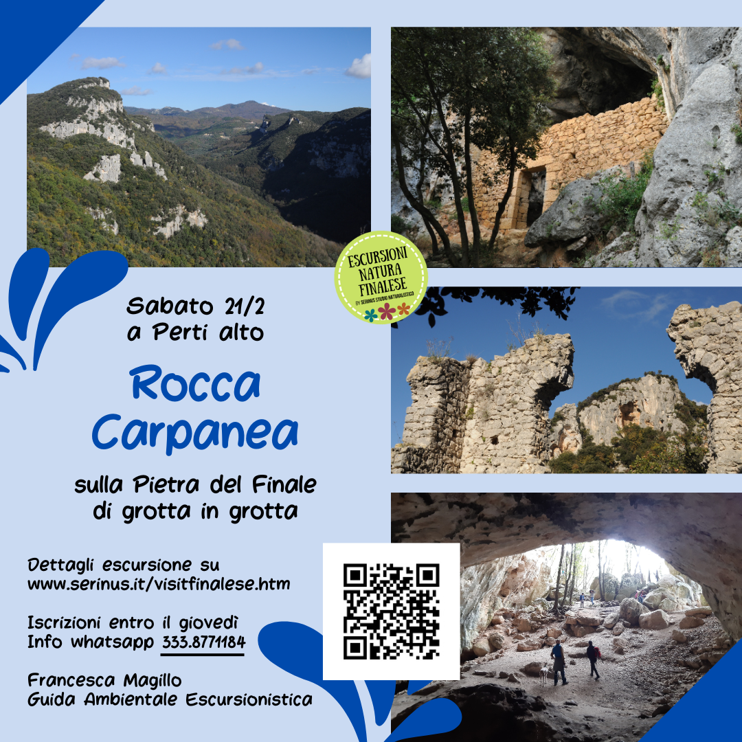 Escursione avventurosa da Perti alto nel tipico paesaggio rupestre della Pietra del Finale, intorno alla Rocca Carpanea. Saliamo al Castrum Perticae per via alternativa e panoramica, ci fermiamo a pranzare e quindi proseguiamo nella silenziosa valle Erxea infilandoci in due grotte ad antro poco conosciute. Giunti ad una cima rocciosa affacciata sopra ai prati di Pianmarino, uno stretto e nascosto sentiero ci porta alla grotta Pollera. Sul rientro visitiamo poi la misteriosa Arma do Principà con il suo maestoso portale di ingresso.