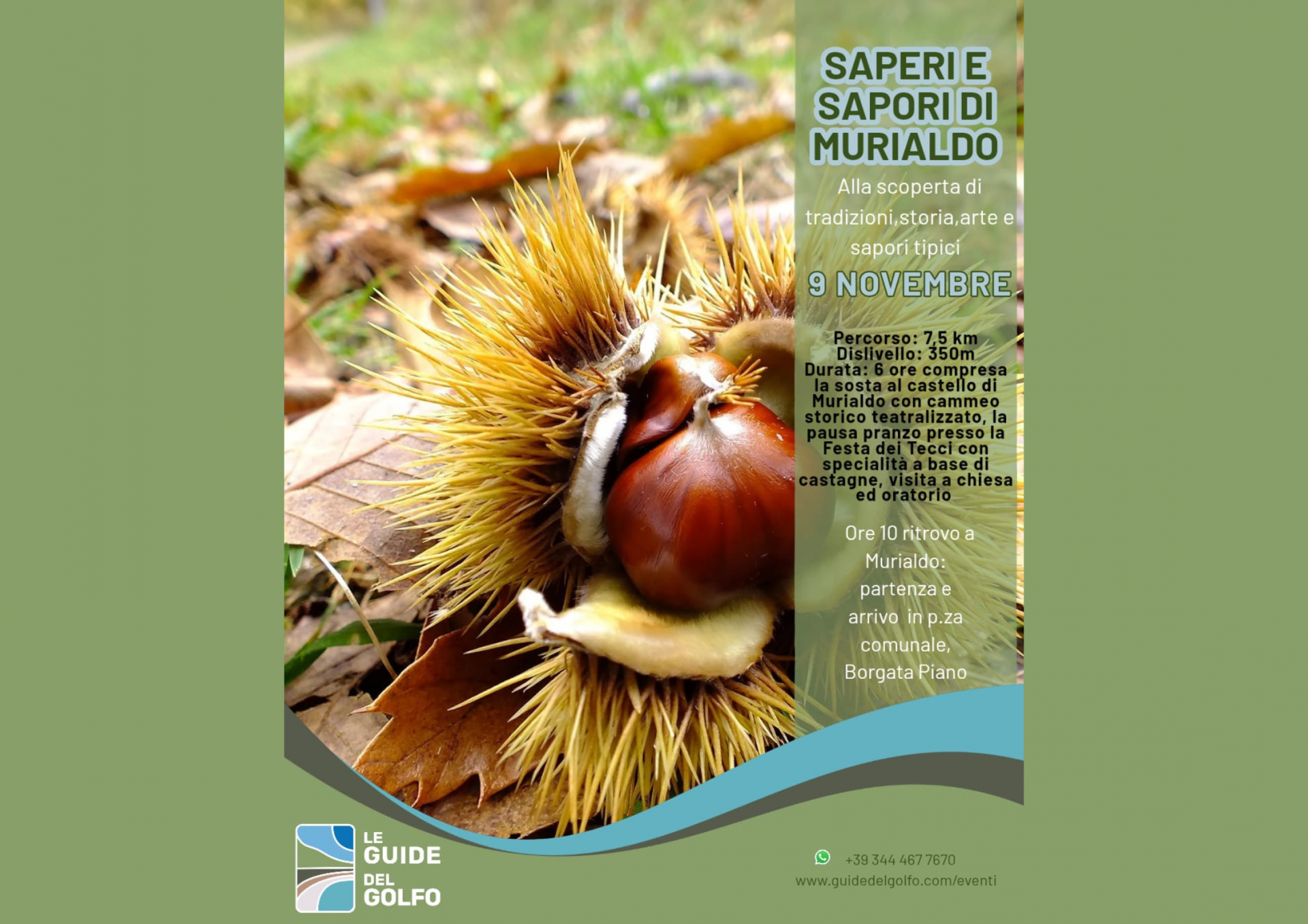 Partecipa a un percorso di 7,5 km con un dislivello di 350 metri, della durata di circa 6 ore, che include una sosta al suggestivo castello di Murialdo, dove assisterai a un cameo storico teatralizzato. La pausa pranzo si svolgerà presso la Festa dei Tecci, un’occasione unica per gustare specialità a base di castagne, prodotto simbolo del territorio.