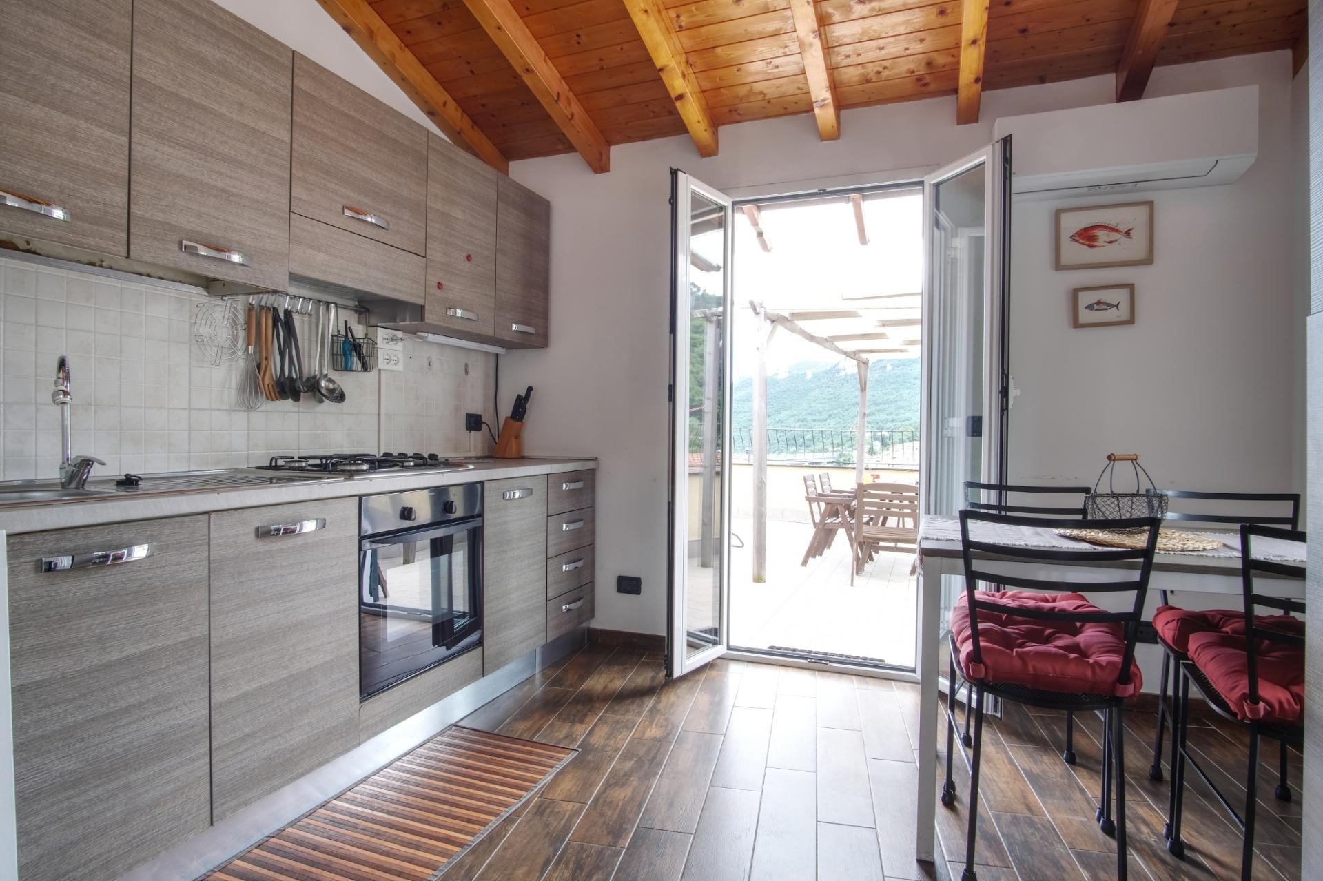L’appartamento è luminoso avendo una vista molto aperta sulle colline intorno al paese. L’ampio terrazzo, in parte coperto da una pergola, permette di consumare i pasti, rilassarsi e prendere sole in tutto relax. Nella camera da letto è possibile avere o i due letti singoli oppure uno matrimoniale.